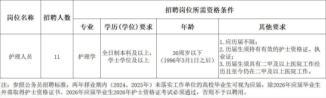 2026年2月13日,黄山市仁和人力资源服务有限公司发布了《黄山市仁和人力资源服务有限公司招聘黄山市人民医院护理人员公告》,至2026年3月2日报名截止,报名人数未达到招聘计划数。鉴于以上情况,经研究决定,对招聘岗位条件作出如下调整,并延长报名时间至2026年3月16日。其中,2024、2025年应届毕业生报名需提供未参加社会保险证明,其他报名事宜以原公告为准。