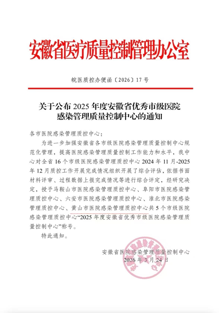 2026年3月,安徽省医院感染管理质控中心完成了对2025年度全省16个市级院感质控中心工作的综合评价,黄山市医院感染管理质控中心凭借优异表现获评市级“优秀质控中心”,成功实现该荣誉“四蝉联”(2023年因省中心主委换届未开展评价),全省仅5个地市获此殊荣。