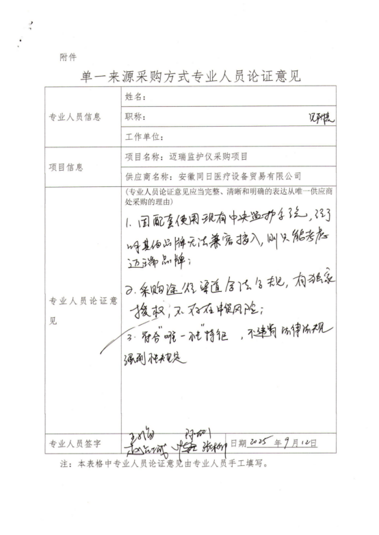 本项目配套使用现有中央监护系统,经了解其他品牌无法兼容接入,则只能考虑迈瑞品牌。根据《中华人民共和国政府采购法》第三十一条,“符合下列情形之一的货物或者服务,可以依照本法采用单一来源方式采购:(一)只能从唯一供应商处采购的。因此采购人申请本项目采用单一来源方式采购。