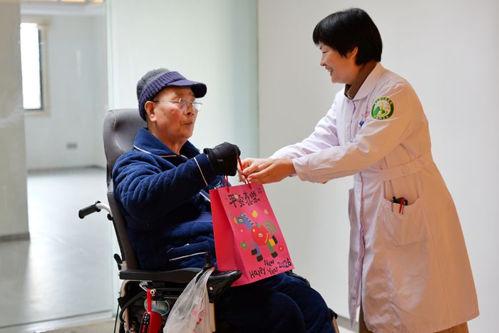 针对行动不便、长期卧床的老人,医疗团队则开展了床边巡诊。伤口造口专科护士为压疮患者换药并进行护理评估,同时对护理员开展压疮预防、体位管理等专业指导。党员志愿者们同步开展暖心慰问,为老人们送上慰问品,传递关怀与温暖。
