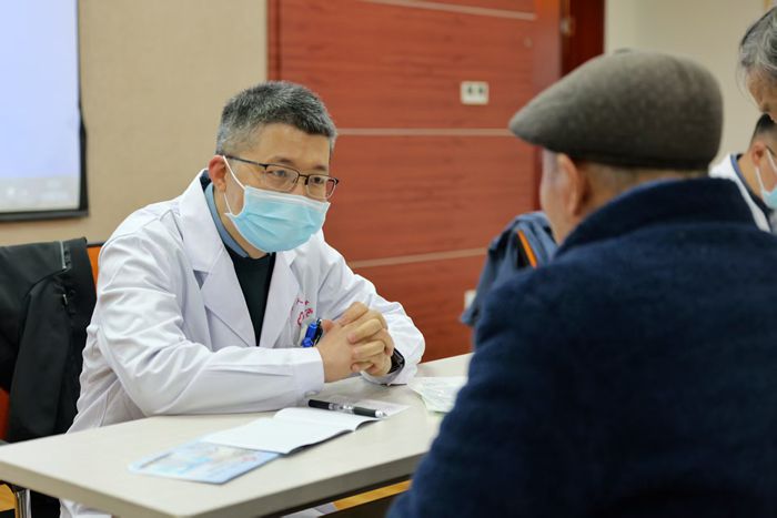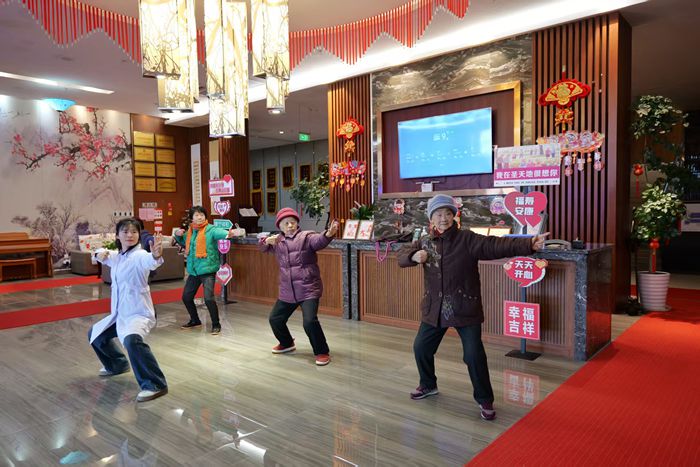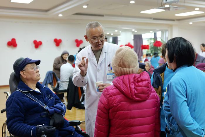 由老年科、神经内科、全科医学科、康复科等专科医师及骨科护理、中医护理、伤口造口护理专科护士组成志愿服务团队,围绕老年人常见病、慢性病开展健康义诊、用药指导、基础健康监测、中医护理体验等服务。监测中发现一位老人血糖高达32mmol/L,团队立即与颐养中心医护人员对接,制定后续治疗和饮食方案。中医护理小组还带领老人们练习八段锦,通过柔和缓慢、动静结合的传统功法,帮助老人们舒筋活络、调养身心,深受现场老人们的欢迎。